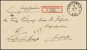 "Greifswald 1a", 1876-1877, je klarer K1 auf drei Orts-R-Briefen (dabei R-Zettel "Eingeschrieben No." des dortigen Postamts) mit rs. schönen Vignetten als Postsache "Wechsel zum Protokoll"