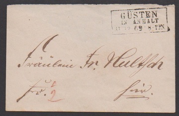 "Güsten in Anhalt", 1869, Ra3 auf hübschem kleinem Billet-Ortscouvert (rs. fehlt eine Viertelklappe) mit hs. Bartaxe "1/2"
