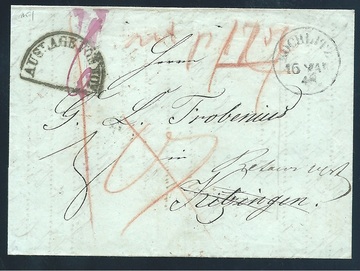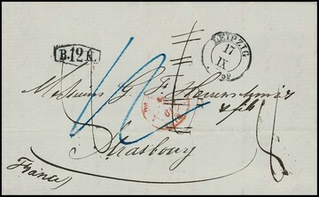 "Leipzig", K2 1859 auf Taxbrief via Baden (Ra1 "B.12.K.") nach Straßburg mit versch. geänderten Taxen