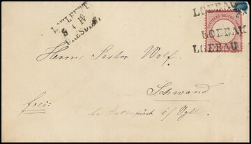"Loebau", dreifacher Bahnpost-L1 als Markenentwertung, BP-L3 "Kohlfurt-Dresden" nebengesetzt, auf Couvert mit 1 Gr. kl. Brustschild (re. oben Tintenspur, dort etwas "eckrund")