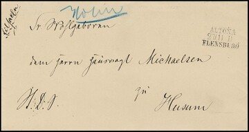 "Holm", 1867, seltene handschriftliche Aufgabe der Briefsammlung, nebst Zug-L3 "Altona-Flensburg", auf sauberem Brief