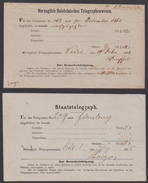 "Kiel", Staatstelegraph 1865, Herzoglich Holsteinisches Telegraphenwesen 1866, zwei vorgedruckte Telegramm-Quittungen