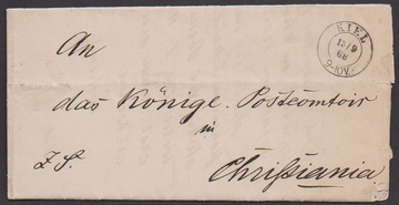 "Kiel", K2 1868 auf seltener Zeitungssache (hs. "Z.S."), Brief an das Postcomtoir in Christiania/Norwegen (leichte Gebrauchsspuren), mehrseitiger Inhalt mit der Bestellung einer Zeitung, ins Ausland ungewöhnlicher Vorgang!