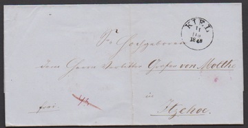 "Kiel", 1848, Fraktur-L1 bzw. K1 auf zwei Briefen, sowie K2 "Kieler Bahnhof" auf zwei Briefen 1851 ("ZI" und "ZII")