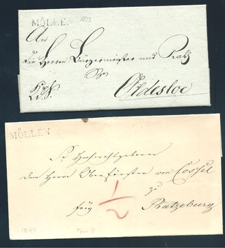 "Mölln", je L1 "MÖLLEN" auf zwei Briefen, einer mit Inhalt 1823