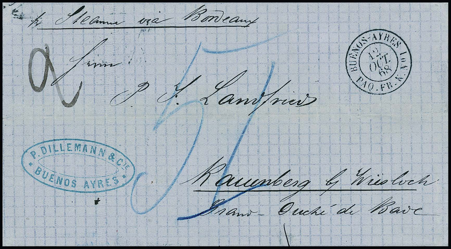 Incoming-Mail, 1868, klarer K1 "Buenos Ayres Paq Fr. K. No. 1" auf dekorativem blauem Faltbrief mit Inhalt, hs. "Steamer via Bordeaux", nach Rauenberg