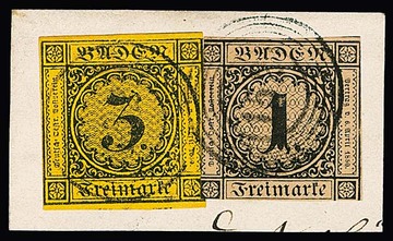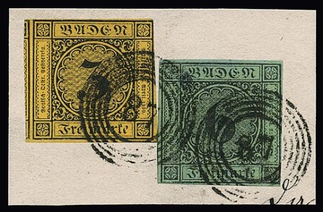 1 Kr. schw./bräunlich, weitgehend voll- bis breitrandiges Prachtstück, nebst oben angeschnittener 3 Kr. schw./gelb auf Briefstück mit NS "36" (Emmendingen), sign. Engel. Mi. für Brief 5000,-