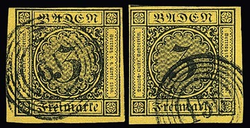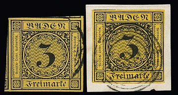 3 Kr. schw./dunkelgelb, zwei Kabinettstücke, voll-, meist breitrandig, beide mit Nebenmarken, einmal fast "bildfrei" gestempelt