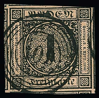 1 Kr. schw./bräunlich, ungewöhnlich geschnittenes Prachtstück, oben rechts ganz winzig berührt, sonst alle vier Seiten Nebenmarken