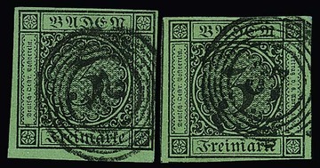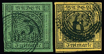 3 Kr. schw./grün (kleine rechte untere Bogenecke) und 6 Kr. schw./orangegelb (drei Seiten Nebenmarken), ausgesprochen riesenrandige Kabinettstücke, sign. Stegmüller