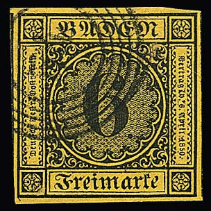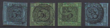 1 Kr. schwarz, 3 Kr. schw./grün, 6 Kr. schw./gelb (zwei Seiten Nebenmarken) und 3 Kr. schw./blau (links unten Plattenfehler), vier ausgesucht breitrandige Kabinettstücke