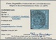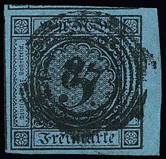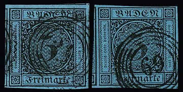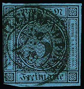 3 Kr. schw./blau, weitgehend voll- bis breitrandiges Prachtstück mit seltener Fremdentwertung durch Württemberger Bahnpost-K2 "FAHREND. POSTAMT". Sign. Englert und Fotoexp. Stegmüller "einwandfrei"