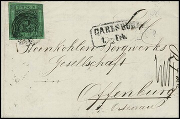 3 Kr. schw./grün, weit überrandig, alle vier Seiten Nebenmarken (!), auf etwas knittrigem Faltbrief von Carlsruhe 1857