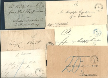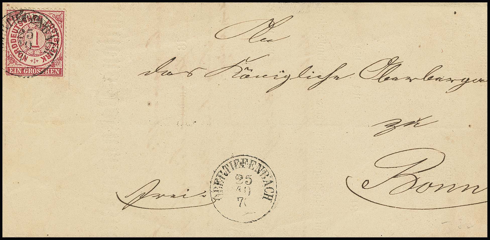 "Obertiefenbach", seltener nachverw. blauer K1 auf Faltbrief mit NDP 1 Gr. (und loser 1/2 Gr.), sowie in schwarz auf Briefen 1 Gr. NDP (Vs.), 1 Gr. gr. Brustschild, auf zwei Pfennig-Belegen und dreimal lose