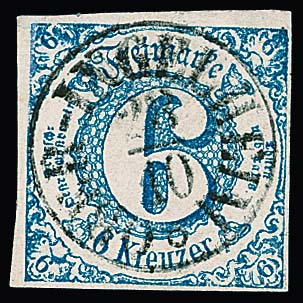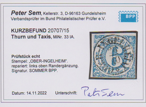 "Ober-Ingelheim", zentrischer K1 auf 6 Kr. blau, wahrscheinlich aus der linken oberen Bogenecke stammend (links oben kleine Randergänzung), sign. Sommer und Fotoexp. Sem