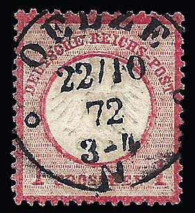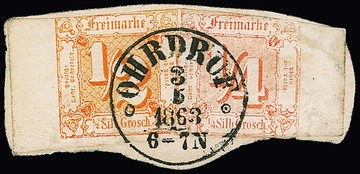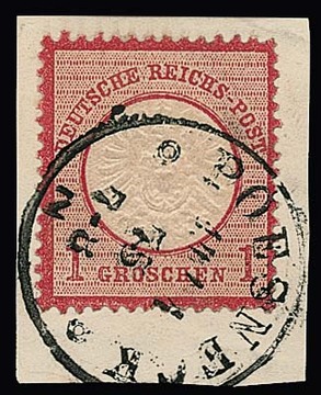 "Poesneck", der nachverw. K1 auf Briefstück 1 Gr. Brustschild vom 14.1.75, ein kurzer Zahn, seltener währungsfremder Aufbrauch der Groschen-Marke im ehemaligen Kreuzerbezirk. Fotoexp. Krug