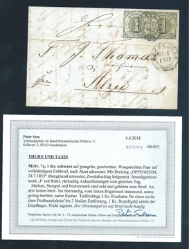 "Oppenheim", K2 mit Zierstücken als Entwertung auf Faltbrief (leichte Gebrauchsspuren) mit Paar erste Ausgabe 1 Kr. schw./graugrün (leichte Knitter), Fotoexp. Sem