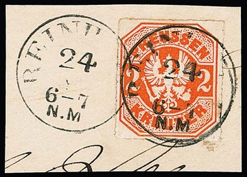 "Oelze", seltener nachverw. K1 ideal zentr. auf Kabinettbriefstück 1 Gr. NDP, gez., und auf 1 Gr. kl. Brustschild. Dito auf weiterem Bfst. und loser 1 Gr. NDP, diese aber Mängel