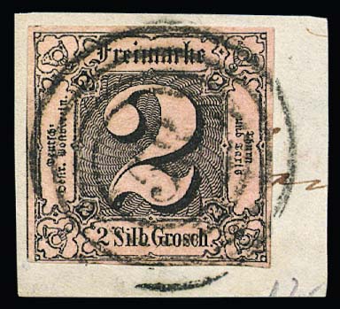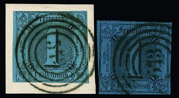 2 Sgr. schw./rosa, zwei teils sehr breitrandige Kabinettstücke (einmal vom Rand, ein Briefstück mit zentr. NS "58"), beide sign. Sem