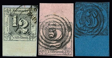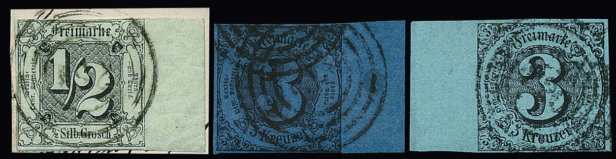 1/2 Sgr. schw./graugrün und 2 Sgr. schw./rosa, sowie 3 Kr. schw./dunkelblau, drei sehr große Randstücke oben bzw. unten, zweimal etwas ber., einmal Bugspur