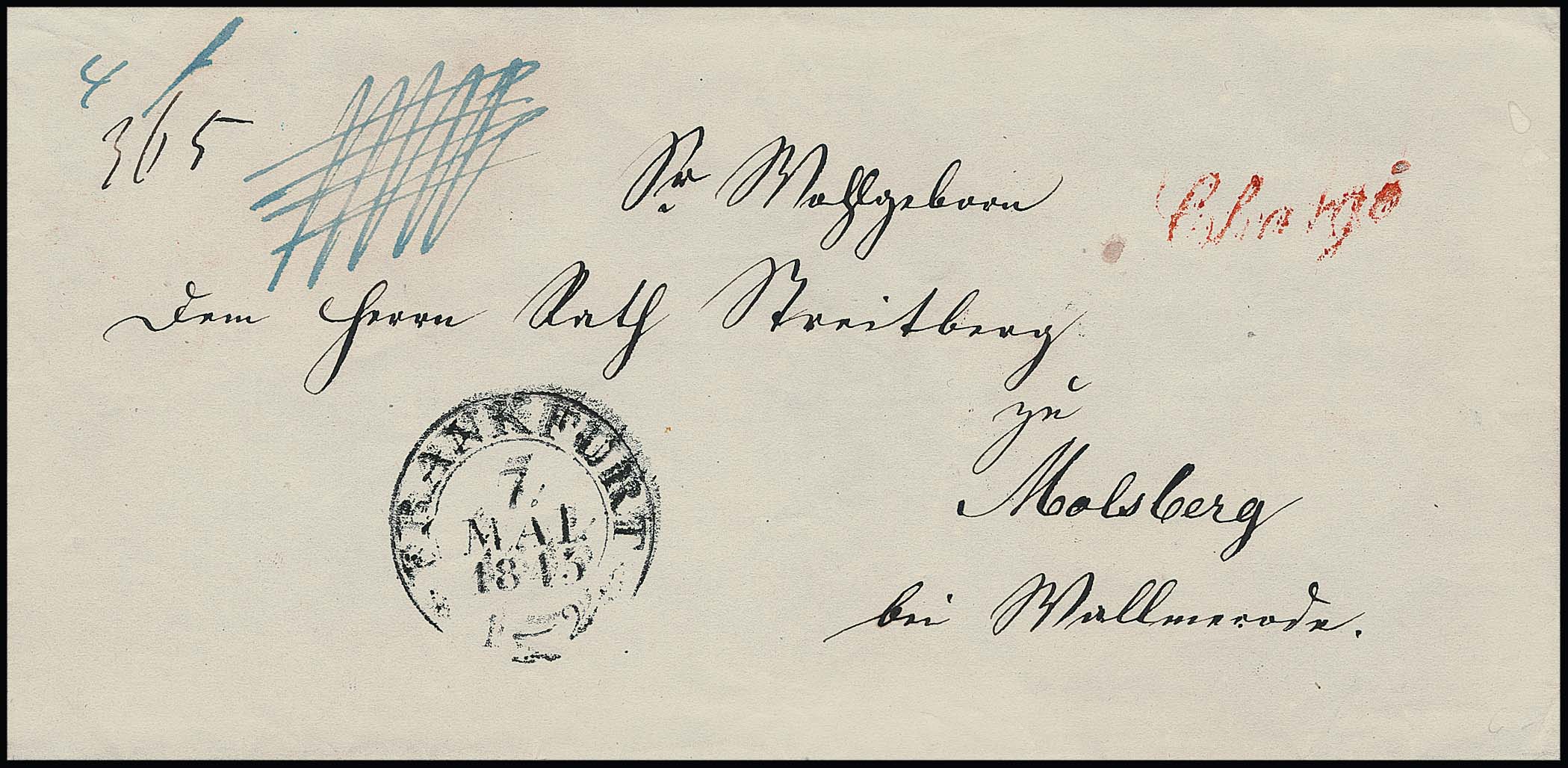 Portofreiheiten, 1845-1867, drei Chargébriefe mit Portofreiheiten, einmal aus Frankfurt in der 4. Gewichtsstufe, aus Hildburghausen und aus Lauterbach, dieser an den Großherzog, bei allen mußte nur die Chargégebühr bezahlt werden, für das Briefporto bestand Portofreiheit