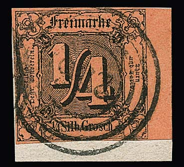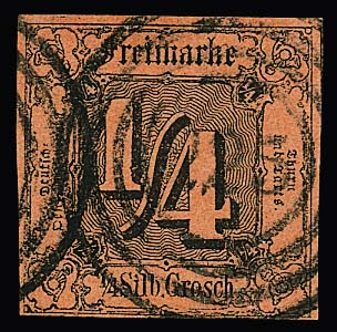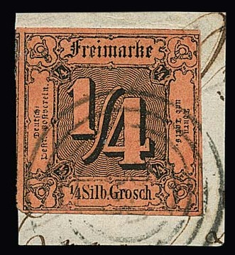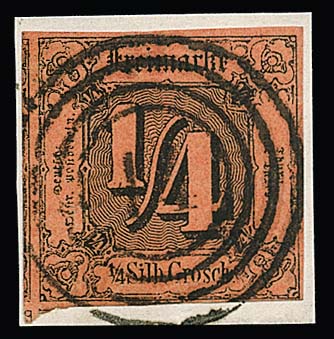 1/4 Sgr. schw./braunorange, Taxisschnitt, einzeln auf Orts-Drucksache 1861 aus Gera, Marke mit NS entwertet, aber ohne Orts-Nebenstempel