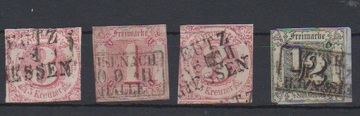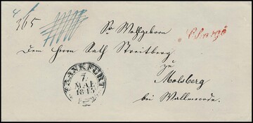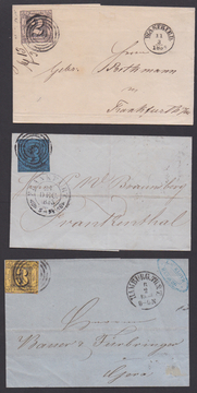 Vier Prachtbriefe: 2 Sgr. schw./rosa aus Wanfried, 3 Sgr. (teils überrandig) aus Hamburg, 3 Kr. aus Frankfurt, sowie riesenrandige 9 Kr. (Nebenmarken) aus Mainz