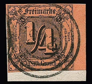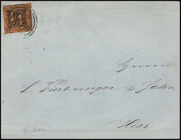 1/4 Sgr. schw./braunorange, breitrandig, rechts Bogenrand, auf Kabinettbriefstück mit NS "236" (Kaltennordheim), vielfach sign., u.a. Haferkamp, Bühler