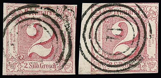 2 Sgr. rot, zwei riesenrandige Kabinett-/Luxusstücke, beide vom linken Bogenrand, zwei bzw. drei Seiten Nebenmarken, je sign. Pfenninger