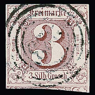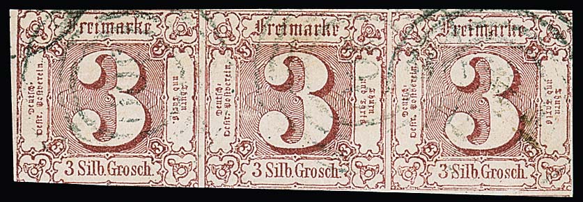 3 Sgr. rotbraun, Dreierstreifen, ausgabetypischer Schnitt, mit NS "300" (Hamburg), Mi. 450,-