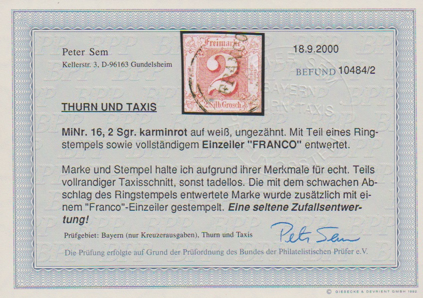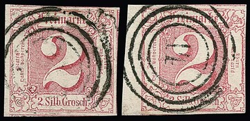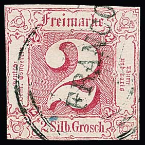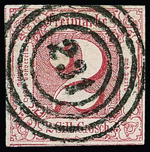 2 Sgr. rot, üblich geschnitten, mit seltener Abstempelung durch schwachen Nummernstempel und zusätzlich L1 "FRANCO", Fotoexp. Sem