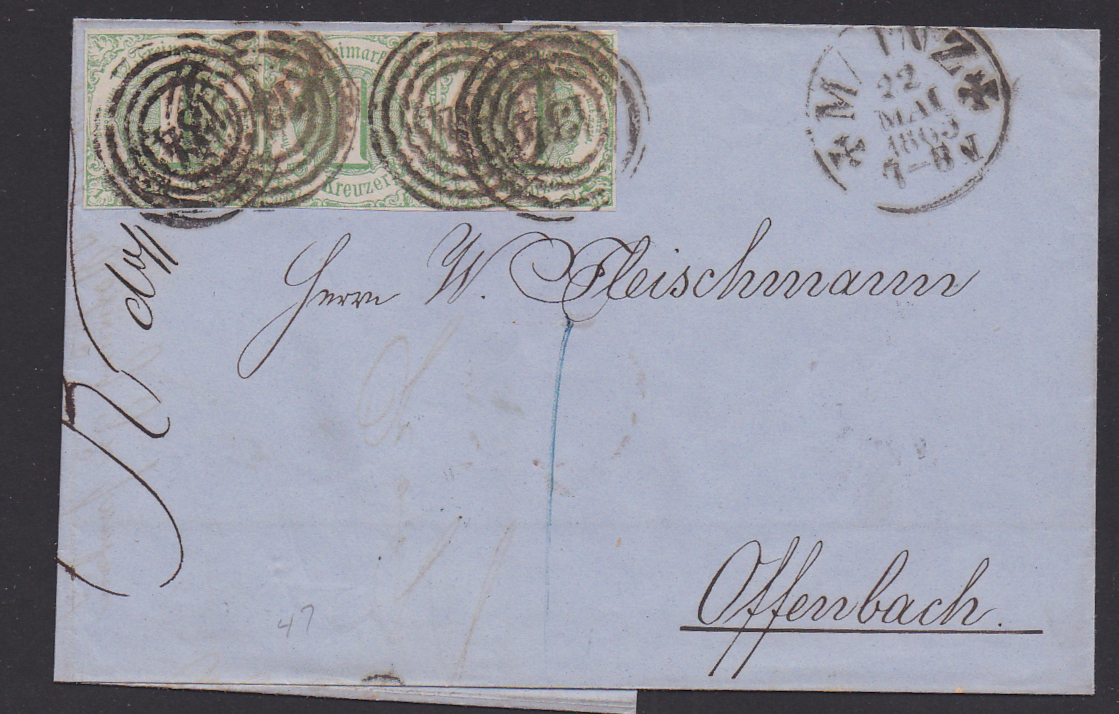 1 Kr. grün, allseits breitrandiger (!) Dreierstreifen mit vier NS "134" auf Prachtbrief von Mainz 1865 nach Offenbach