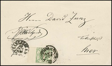 1 Kr. grün, meist vollrandig, links 11mm breiter Bogenrand, auf Ortscouvert aus Frankfurt, Fotoexp. Sem