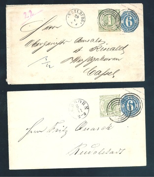 1 Kr. grün je auf zwei Ganzsachen 6 Kr. blau aus Herborn bzw. Weilburg, einmal Taxisschnitt, einmal oben noch voll-, sonst dreiseitig mit Nebenmarken (kl. Randtönung)