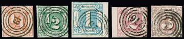 1/4 Sgr. rotorange bis 3 Sgr. rotbraun, komplette Serie als ausgesucht breitrandige, meist Kabinett-/Luxusstücke, oft mehrere Nebenmarken, z.B. 1/2 Sgr. grün und 3 Sgr. an drei Seiten