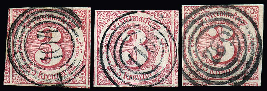 3 Kr. rot, drei überrandige Kabinett-/Luxusstücke, einmal vom Rand und Nebenmarken, die beiden anderen Marken drei bzw. alle vier Seiten Nebenmarken! Sign. Sem