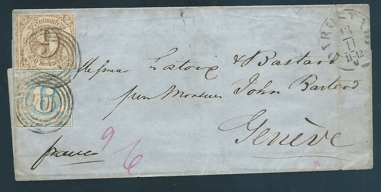 6 Kr. blau (sehr breitrandig) und 9 Kr. ockerbraun auf Damenbrief (Gebrauchsspuren) von Darmstadt 1864 nach Genf/Schweiz