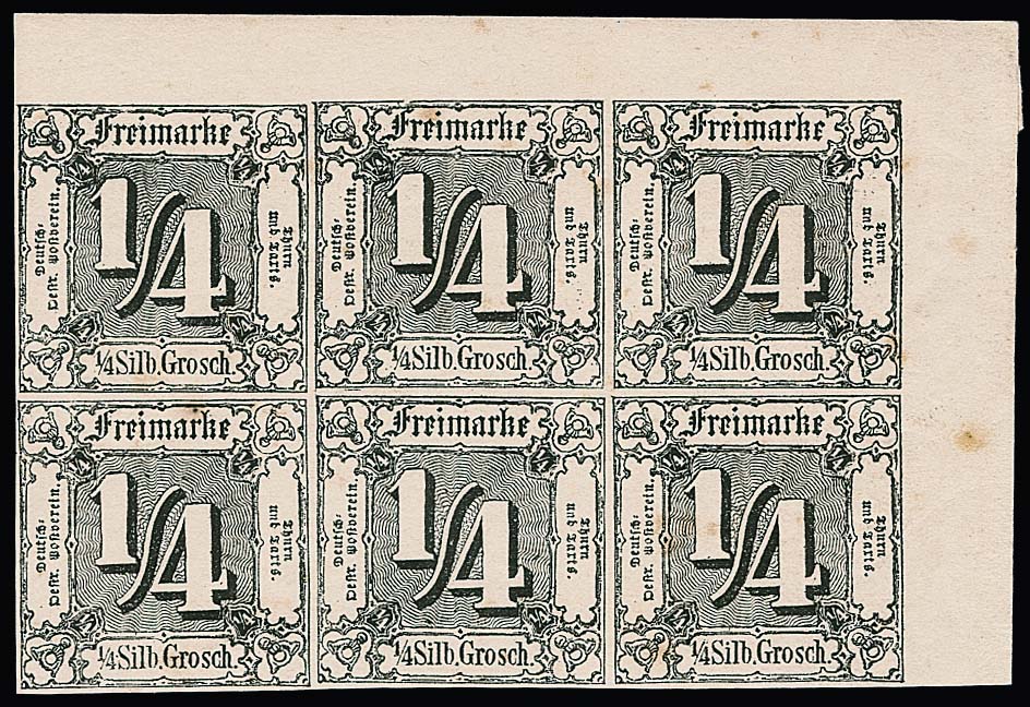 Zweite Ausgabe, 1/4 Sgr. schwarz und 1/2 Sgr. dunkelorange je in postfrischen Rand-Viererblöcken, 2 Sgr. blau im teils postfrischen Rand-Viererblock (eine Marke min. hell), 3 Sgr. im postfr. Sechserblock (linkes Paar Bugspur), sowie 9 Kr. ockerbraun im bis auf eine Marke postfrischen Viererblock. Mi. lose 1540,- ++