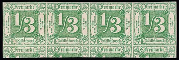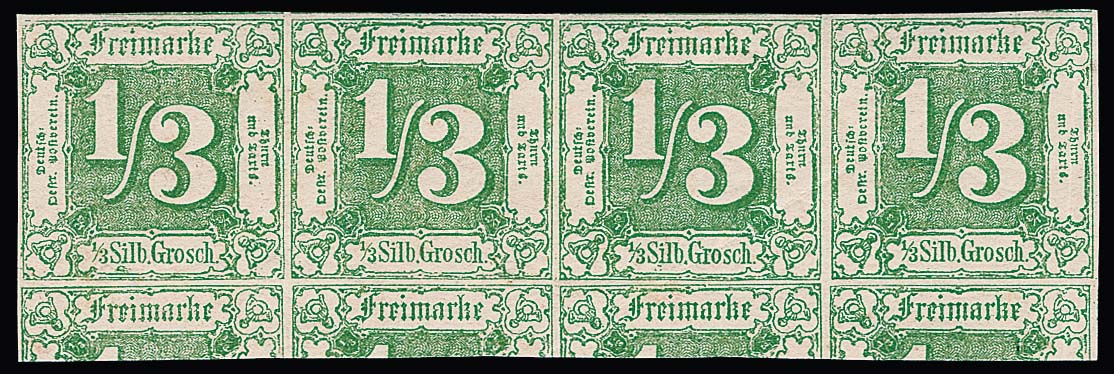 1/3 Sgr. gelbgrün, "verschwenderisch" geschnittener waagerechter Viererstreifen mit unten 1/3 Nebenmarken. Drei Werte postfrisch, einer ungebraucht (leichter Gummibug)