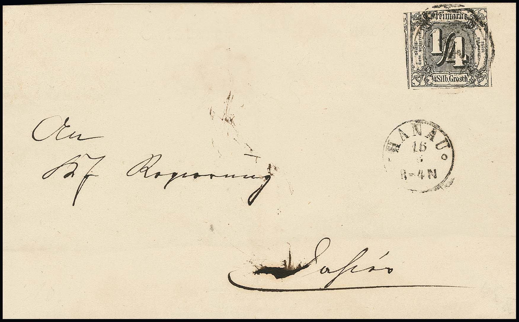 1/4 Sgr. schwarz, üblicher Schnitt, einzeln auf Ortsbrief aus Hanau, Mi. 400,-