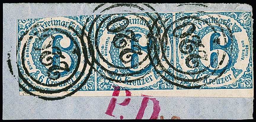 6 Kr. blau, seltener Unterrand-Dreierstreifen, rechte Marke vollrandig, die beiden linken oben schräg geschnitten, auf Briefstück von Auslandsbrief mit NS "220", sign. Helbig