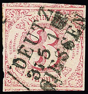 3 Kr. rosa, Schnittriese (mehrere Nebenmarken) mit preußischem Bahnpost-L3 "Deutz-Giessen"