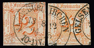 1/2 Sgr. rotorange, zwei Exemplare (Schnittfehler) je mit seltener Fremdentwertung durch preußische Stempel, K2 "Gelsenkirchen" und K1 "Magdeburg"
