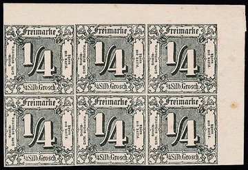 1/4 Sgr. schwarz, postfrischer Sechserblock aus der rechten oberen Bogenecke (min. Braunpünktchen), lose Marken 360,- Mi.