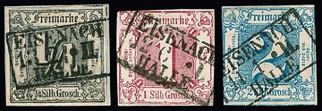 1/4 Sgr. schwarz (rep., hierauf sehr selten!), zweimal 1 Sgr. rot (kl. Mgl.) und 2 Sgr. blau, je mit seltener Entwertung durch preußischen Bahnpost-Ra3 "Eisenach-Halle"