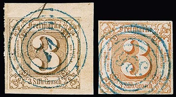 3 Sgr. ockerbraun, zwei Kabinettstücke je mit blauem NS: "71" (Steinb.-Hallbg.) auf Briefstück, sowie "326" (Oerlinghausen) lose (sign. Brettl, Haferkamp)
