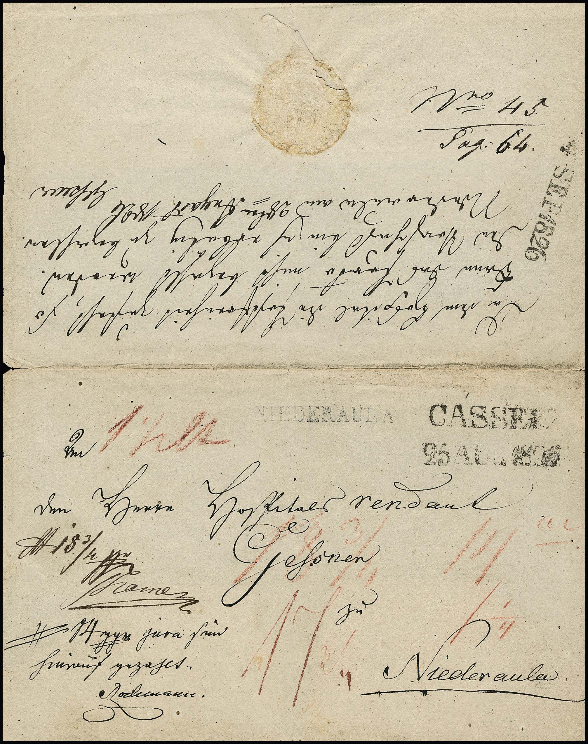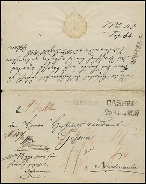 "Cassel", 1826, L2 auf zur Präsentation dreiseitig geöffnetem Chargé-Wertbrief nach Niederaula (vs. Ankunfts-L1), rs. hs. "da dem Hospital die Portofreiheit zusteht, so wird das Porto nicht bezahlt werden. Den Vorschuß bin ich erbötig zu bezahlen. Niederaula ..." mit Unterschrift des dortigen Postmeisters