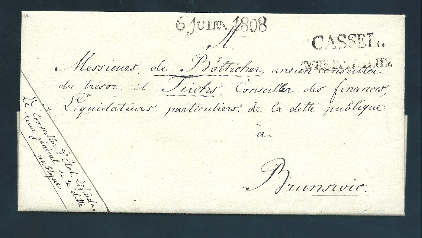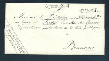 "Cassel Westphalie", L2 nebst Datums-L1 "6. Juin 1808" auf Luxusbrief nach Braunschweig (dekor. vorgedruckter Briefbogen)
