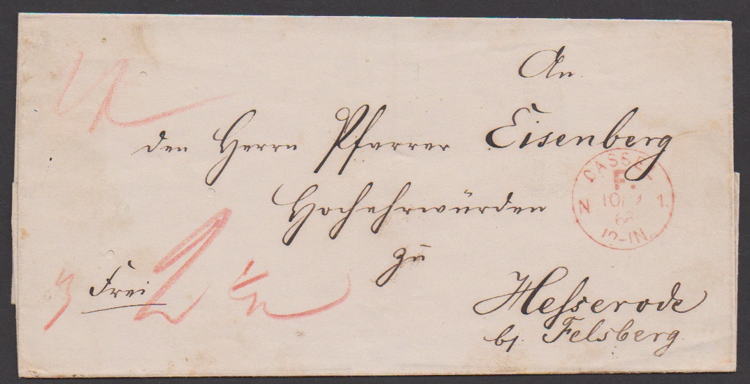 "Cassel F.N.1", 1868, roter Franko-K1 auf Brief mit ungewöhnlicher Taxe "2 1/2" nach Hesserode (Doppelbrief plus Bestellgeld)