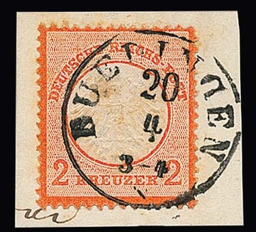 "Buedingen", nachverw. K1 klar auf Briefstück 2 Kr. kl. Brustschild, leichte Tönung im Prägefeld, Mi. 400,-